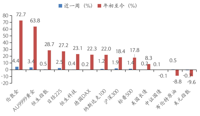上周金价延续强势,国际金价站上4500美元再创历史新高,国内AU9999重回1000关口。伦敦现货黄金收于4,533美元/盎司(周环比4.4%),国内AU9999黄金收于1,007元/克(周环比3.4%)。